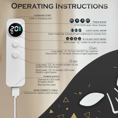 【Safety and Eco-friendly 】Our LED facial mask is made of skin-friendly silicone material, which is safe , non-toxic, foldable and easy to clean. Built-in timer which is 5/10/15/20 minutes respectivelyto avoid excessive used and make you safe when sleeping. Really a great way to improve your skin health and enjoy comfortable at home. Recommended 10-20 mins per time,3-5 times a week, 4 consecutive weeks as a cycle.