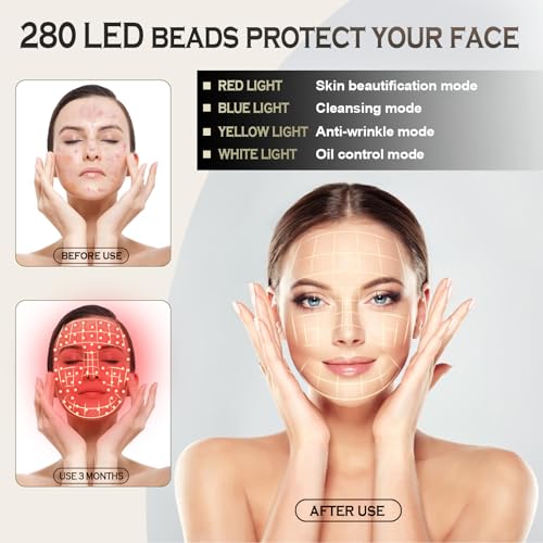 【 Led Face Mask Light Therapy】Light therapy is a non-invasive treatment that uses light to promote skin health and beauty. Our red light therapy device features 280 LEDs that emit wavelengths of light that are beneficial for the skin.It has been used to resolve a variety of skin conditions, including skin rejuvenating, reduction wrinkles, and anti-aging,etc. For the first use, please fully charge the device, and do not use it while charging. If the light does not light up during use, check whether the connection cable is loose.