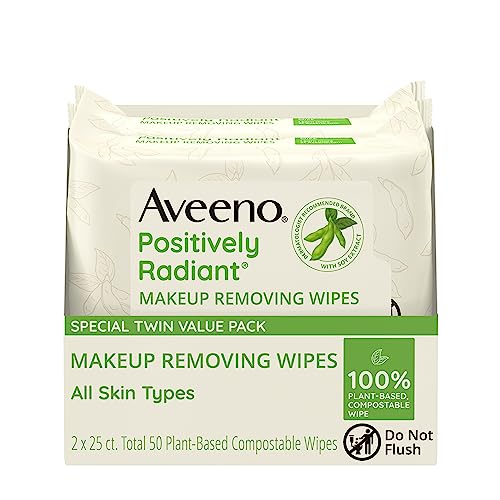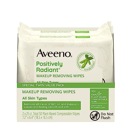 Aveeno Positively Radiant Oil-Free Makeup Removing Face Wipes to Help Even Skin Tone and Texture with Moisture-Rich Soy Extract, Gentle Facial Cleansing Wipes, Twin Pack, 2 x 25 ct.