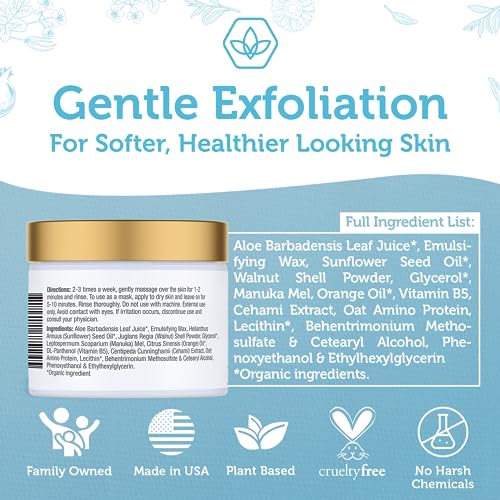 Made For Sensitive Skin. This scrub is non toxic with no parabens. It’s of the highest quality botanical skin care products containing organic Aloe Vera, Manuka Honey, Walnut and powerful Vitamin C to help protect skin from damaging free radicals and premature aging in our exfoliating scrub and mask for face care.