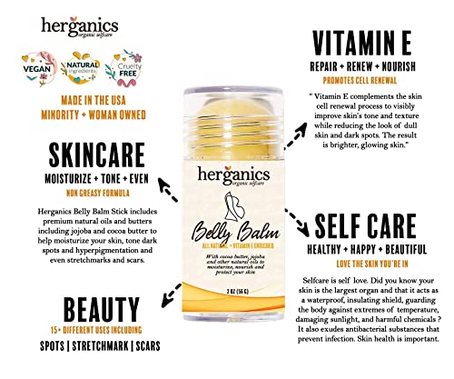 Belly Balm; Herganics Belly Balm Stick is rich in skin loving nutrients with organic sunflower oil, jojoba oil, cocoa butter, shea butter, vitamin e and other natural ingredients.