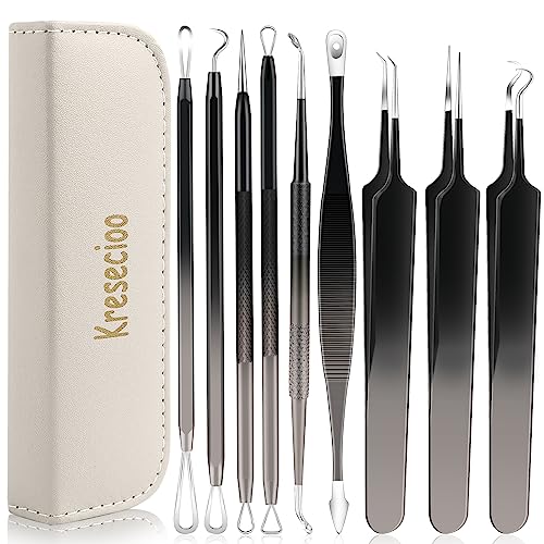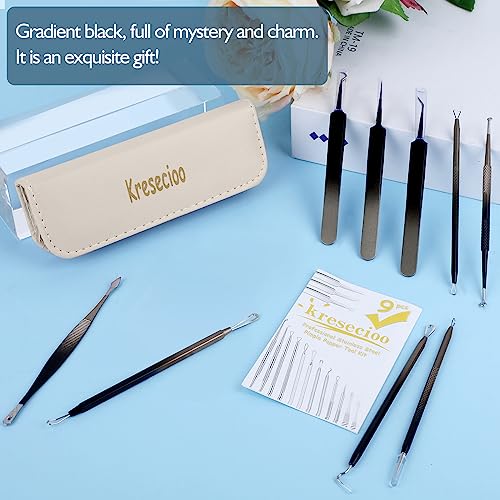 Kresecioo Pimple Popper Tool Kit Blackhead Remover Tools, 9 PCS Professional Pimple Acne Tools Extractor Kit for Nose Face, Stainless Blemish Whitehead Zit Popper Tool with a Leather Bag(Black)
