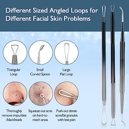 【Perfect Gift-Comedone Extractor Tool】Based on the voice of customers, color innovation have been made to this blackhead remover tools pimple popper tool kit. Gradient black zit popper tool with light silver leather bag. It will be a cool gift for yourself or loving one.