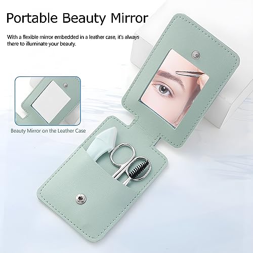 Eyebrow Trimmer Kit, 5-in-1 Set with Eyebrow Scissors, Eyebrow Razor, Tweezer, Brush, and Mirror for Women, Includes Leather Carry-Around Bag (Green).