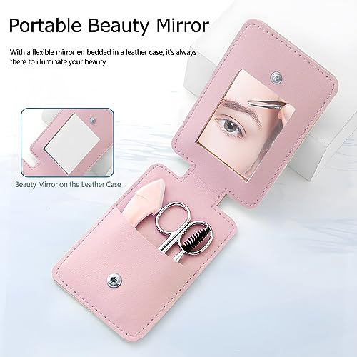 Eyebrow Trimmer Kit, 5-in-1 Set with Eyebrow Scissors, Eyebrow Razor, Tweezer, Brush, and Mirror for Women, Includes Leather Carry-Around Bag (Pink).