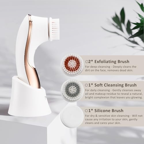 Electric Face Brush Scrubber Rechargeable Facial Exfoliator IPX-7 Waterproof Spin Cleanser Rotating Spa Machine for Exfoliating, Massaging and Deep Cleansing with 4 Brush Heads