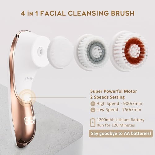 Specification: Electric Face Brush Scrubber Rechargeable Facial Exfoliator IPX-7 Waterproof Spin Cleanser Rotating Spa Machine for Exfoliating, Massaging and Deep Cleansing with 4 Brush Heads