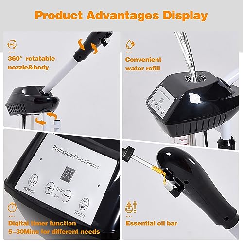 Professional Face Steamer: upgraded heat module design, can use pure water or tap water, quiet and smooth when using. Time setting: 5-30 minutes. There is new essential oil wand design which makes the machine more durable.