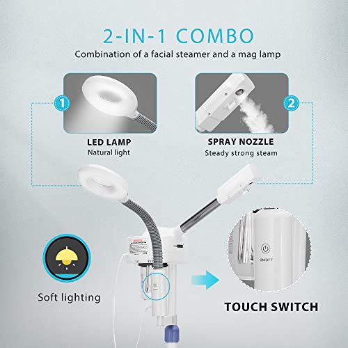 2-IN-1 COMBO – This machine is a combination of a facial steamer and a mag lamp; The nano ion spray produced by the steamer can open your pores, deeply moisturize the skin and promote absorption of skincare products; The water cup is equipped with a UV Lamp, which can kill harmful substances in the water and it is safer for your skin