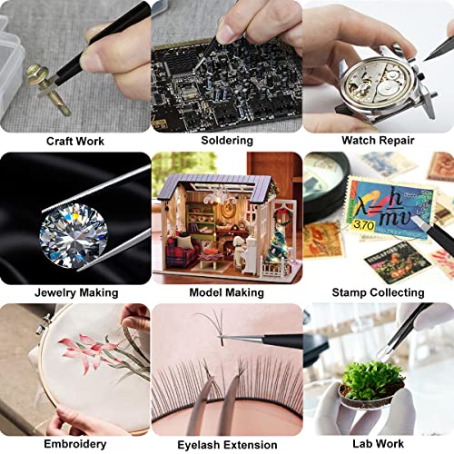 Grab hold of whatever you want! This multifunctional tweezers set has 12 types of tweezers, which suit for Electronics Repair, Craft, Jewelry, Soldering, Lab work, Model making, Stamp or coin collecting, Weeding vinyl design, Ingrown hair removal, Eyelash extension, Eyebrow removal, Paper Sculptures, Embroidery, Phone repair, Watch repair, Cameo, Diamond Painting, eyeglass, apparatus, etc.