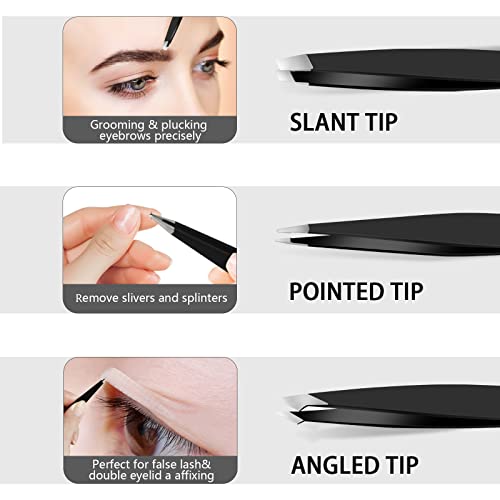 HAIIDOAK Tweezers Set, Professional Stainless Steel Tweezers for Eyebrows, Great Precision for Facial Hair, Splinter and Ingrown Hair Removal (3 Count / 3.8inch, Black)