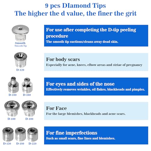 Includes TWO DERMABRASION STAINLESS STEEL HANDLES. 9 PC DIAMOND TIPS which include different sizes and are of fine, medium, and coarse tips so that they can be used in different purposes and locations.