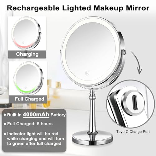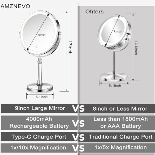 Specification: AMZNEVO Lighted Makeup Mirror, 9″ Rechargeable Vanity Mirror with Lights, Double-Sided 1X/10X Magnification, 3 Color Lights, Brightness Adjustable, 360° Rotation