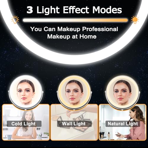 AMZNEVO Lighted Makeup Mirror, 9″ Rechargeable Vanity Mirror with Lights, Double-Sided 1X/10X Magnification, 3 Color Lights, Brightness Adjustable, 360° Rotation