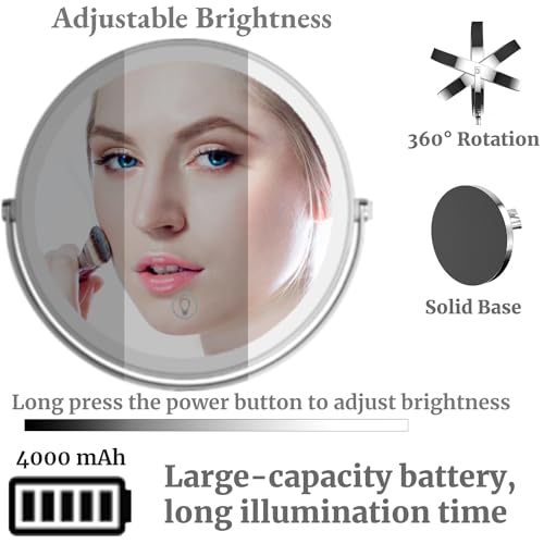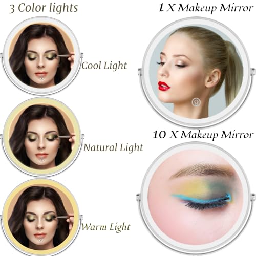 Vanity lighted mirror with magnification has 3 dimming levels: Warm Light, Cold Light and Nature Light. Magnified mirror with lights for makeup desk allows you to put on makeup and check your grooming in places where there is not enough light. Short press the vanity makeup mirror switch to change the mirror light color, long press to adjust light brightness, personal makeup mirrors that light up and magnified creating the perfect makeup ambiance.
