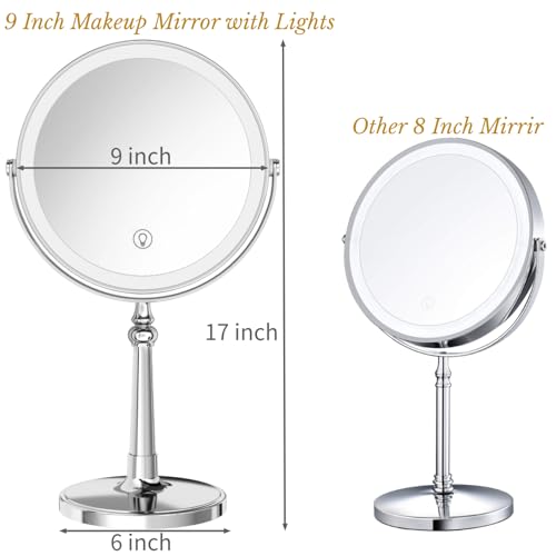 9″ makeup mirror with lights and magnification providing a large and high-definition wide-angle field of view, make up mirror with lighting ensures uniform and soft illumination, lighted makeup mirror with magnification clear focus on face details, large led mirror makeup effortlessly capturing every detail, for a flawless makeup application.