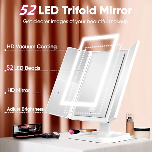 Specification: Makeup Mirror Vanity Mirror with Lights – 52LED Lighted Vanity Mirror, 2000mAh Rechargeable Trifold Mirror 3X/2X/1X Magnification, Touch Sensor, Acrylic Drawer Organizer Makeup Mirror