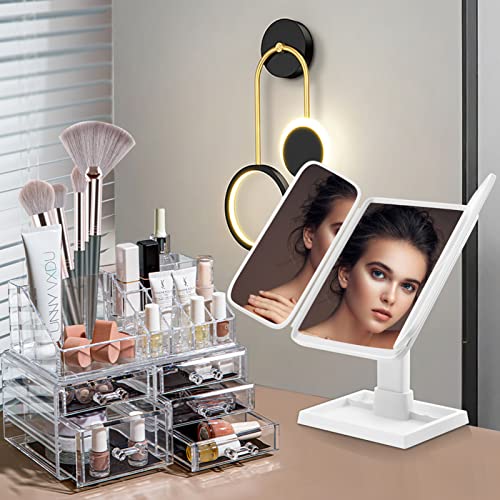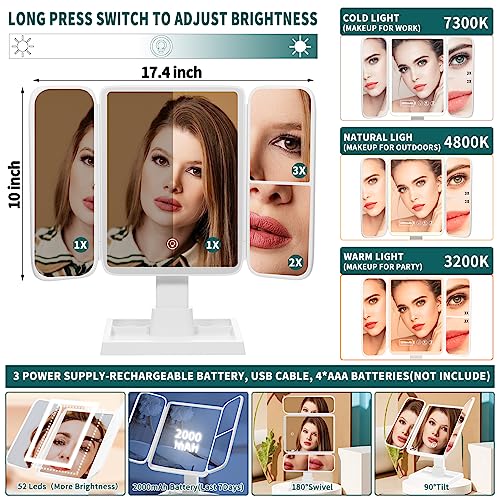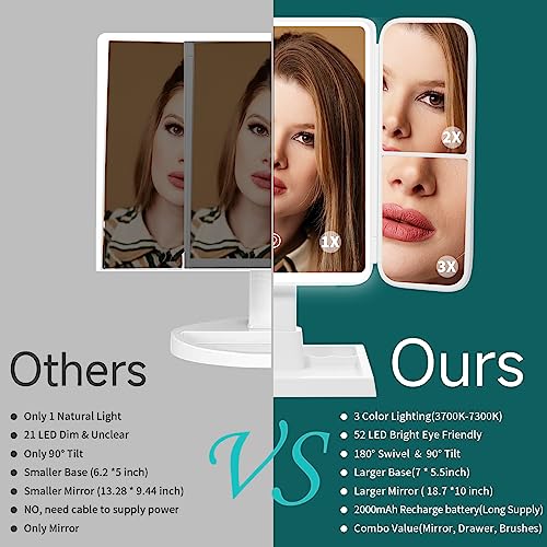 Makeup Mirror Vanity Mirror with Lights – 52LED Lighted Vanity Mirror, 2000mAh Rechargeable Trifold Mirror 3X/2X/1X Magnification, Touch Sensor, Acrylic Drawer Organizer Makeup Mirror