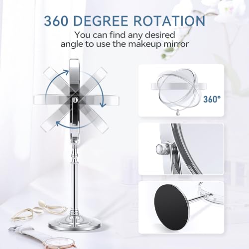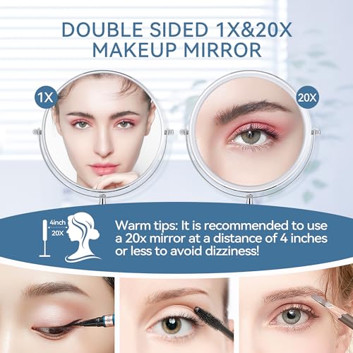 20X/1X Magnifying Mirror: This magnifying mirror with stand has a double-sided design, one side is an HD 1X mirror for daily makeup, and the other side is a 20X magnifying mirror for eyebrow plucking, mascara application, pupil wearing, and blackhead removal, and other makeup that requires details, for the price of one mirror you get two useful mirrors with different magnifications.