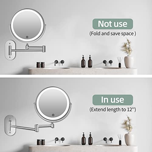 Rechargeable Wall Mounted Lighted Makeup Vanity Mirror 8 inch 1X/10X Magnifying Bathroom Mirror with 3 Color Lights, Double Sided with Dimmable LED Lights, Extended Arm 360° Swivel Extension Mirror