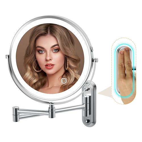 Specification: Rocollos Two-Fingers-Width Narrow Base Rechargeable Wall Mounted Lighted Makeup Mirror,3 Color Lights Dimmable Touch Screen,8 Inch LED Double Sided 1X/10X Magnifying Mirror 13 Inch Retractable