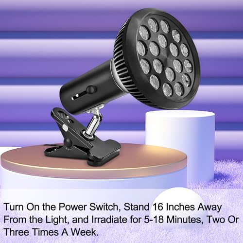 STAND DESIGN: Comes with adjustable clip, easy to use. Adjust the angle, turn on the power switch, stand 16 inches away from the lamp and irradiate for 5-18 minutes, two to three times a week.
