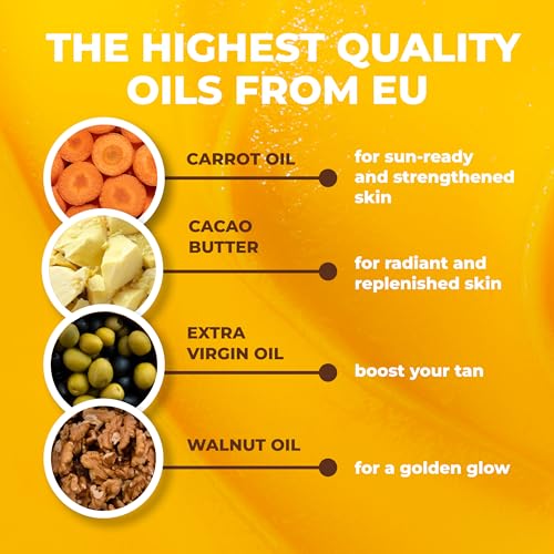 🍊EVERYTHING YOUR SKIN NEEDS FOR THE PERFECT BRONZE – 100% natural carrot oil for sun-ready and strengthened skin, Extra virgin olive oil to boost your tan, Walnut oil for a golden glow and cacao butter for radiant and replenished skin.