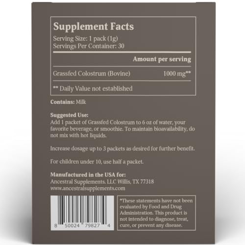 Specification: Ancestral Supplements Grass Fed Beef Bovine Colostrum Powder Packets, Immune Support Supplement, Gut, Skin & Hair Health Support Supplements, Promotes Growth and Repair, Non GMO, 30 Sticks, Unflavored