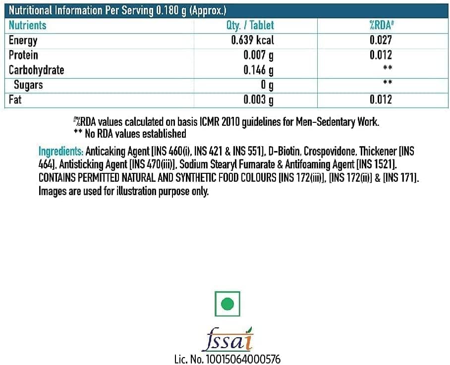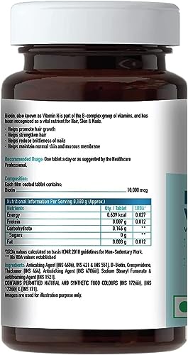 RECOMMENDED DOSAGE: Biotin is a water-soluble vitamin and cannot be stored in the body. Thus, regular supplementation helps maintain the biotin levels in the body. Take one biotin tablet daily or as suggested by your dietician