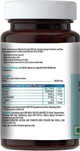 Healthkart HK Vitals Biotin – Complete Nourishment for Hair, Skin and Nails HealthKart HK Vitals Biotin Tablets are a dietary source for Vitamin B7 vital for the body to help concert food into energy. The 10000mg HK Vitals Biotin Tablets are exquisitely crafted to regulate the biotin levels in the body to help in the healthy growth and maintenance of hair, skin, and nails. HELPS IMPROVE HAIR HEALTH Biotin helps stimulate keratin production in hair to promote hair growth, strength & shine for healthy-looking, voluminous hair. VITAL FOR NAIL HEALTH On account of its ability to aid the synthesis of keratin, Biotin helps reduce nail brittleness, strengthens them and helps maintain their shine. HELPS MAINTAIN GLOWING SKIN Biotin is crucial for energy production and also helps in the formation of fatty acids that are essential for nourished, glowing skin.