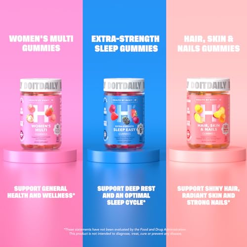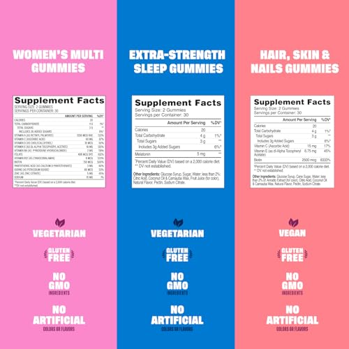 THE BUNDLE: Includes 1 bottle of strawberry-flavored Women’s Multi Gummies (30 servings), 1 bottle of peach-flavored Hair, Skin & Nails Capsules (30 servings) and 1 bottles of mixed berry-flavored Extra-Strength Sleep Easy Gummies (30 servings).
