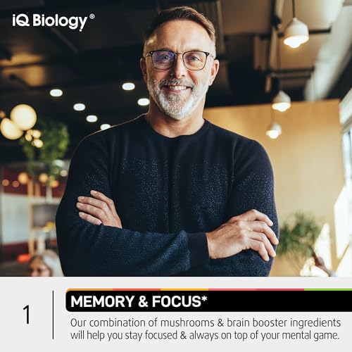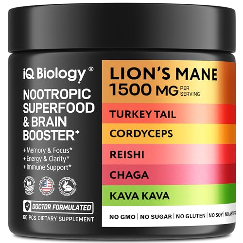 Lions Mane Supplement Capsules – Looking for lions mane supplement? Our IQ Biology Brain Supplements for Memory and Focus* is not only Lion’s Mane but also magnesium supplement, ashwagandha capsules, turmeric supplement, l theanine, inositol supplement, rhodiola supplement, B12 Vitamins, caffeine pills, kava extract, reishi mushroom, turkey tail mushroom capsules, ginseng and more. Not a mushroom powder, so no need to mix everyday dose mushroom coffee with it. 2 capsules a day and no aftertaste.