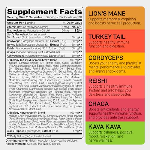 Specification: IQ BIOLOGY Mushroom Supplement Lions Mane Kava Kava Rhodiola Rosea Vitamin B12 Turkey Tail Reishi – Nootropic Mushroom Complex Ashwagandha Magnesium Citrate Turmeric Panax Ginseng Inositol – 60 Caps