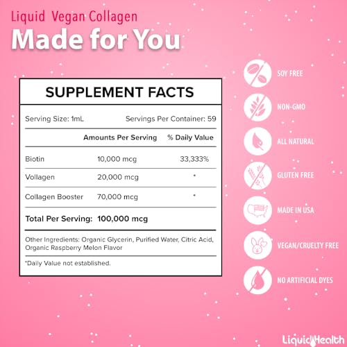 Specification: LIQUIDHEALTH 100% Vegan Collagen Plus Biotin 100,000mcg Liquid Drops – Plant-Based Liquid Collagen for Women, Men – Hair & Nail Growth, Skin Health, Boosts Metabolism – Non-GMO, Sugar Free (2 oz)