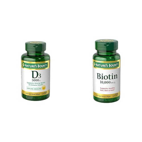 Specification: Nature’s Bounty Vitamin D3, Immune Support, 125 mcg (5000iu), Rapid Release Softgels, 240 Ct & Biotin, Supports Healthy Hair, Skin and Nails, 10,000 mcg, Rapid Release Softgels, 120 Ct