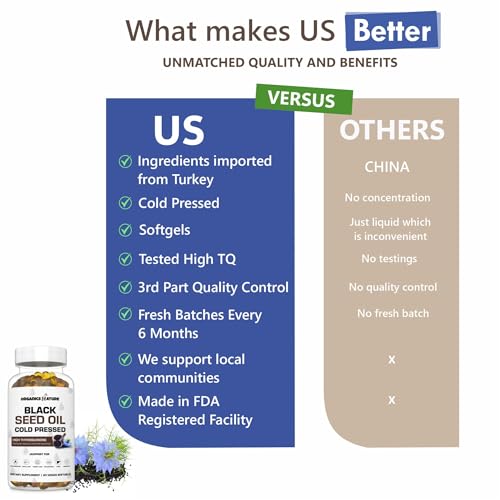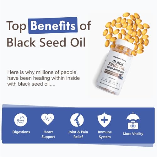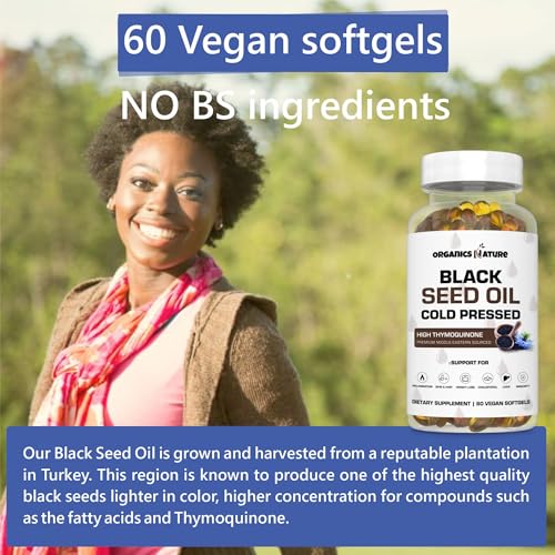Discover the power of Organics Nature Black Seed Oil 1000mg Vegan Softgels, a premium blend of 100% cold-pressed black cumin seed oil capsules with thymoquinone. Packed with Omega 3, 6 & 9, these non-GMO, vegan-friendly softgels provide immune, hair, and brain support. Experience the numerous benefits of black seed oil, including weight loss, with this high-quality supplement. Trust in the approved science behind this life extension formula, which is also available in amazing herbs premium capsules. Boost your health with the natural goodness of nigella sativa capsules, black currant seed oil capsules, and organic black cumin seed oil. Try Vegan Organic Black Seed Oil capsules today and unlock the potential of this blessed seed.