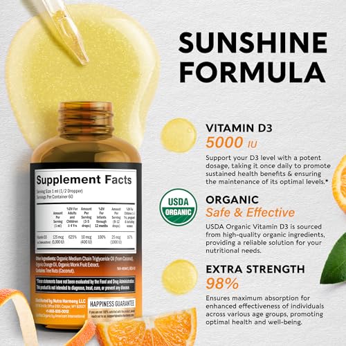 USDA Organic Vitamin D3 Liquid – 5000 iu Vitamin D Drops – Made in USA Supplements – For Kids & Adults, Pregnancy & Children Safe – Immune System, Mood, Bone Health & Muscle Support – 2 Month Supply