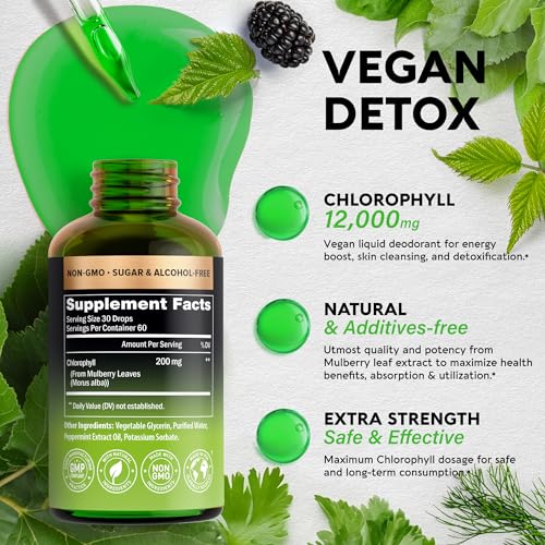 𝟭𝟮,𝟬𝟬𝟬 𝗺𝗴 𝗜𝗻𝘁𝗲𝗿𝗻𝗮𝗹 𝗗𝗲𝗼𝗱𝗼𝗿𝗮𝗻𝘁 – Natural & safe 200 mg of Chlorophyll from Mulberry leaves for 2 whole months supply! Experience the incredible benefits of chlorophyll with our liquid chlorophyll drops. Chlorophyll liquid drops are designed to help you look and feel your best, inside and out. Say goodbye to unpleasant odors from within with chlorophyll drops.